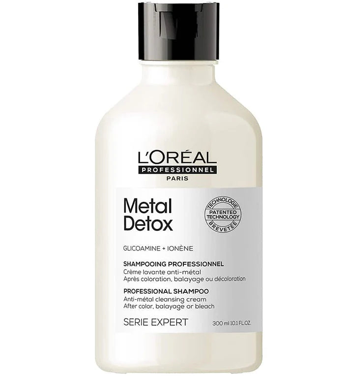L'Oreal Professionnel Serie Expert Metal Detox Shampoo is a sulfate-free cleanser that gently removes metal particles from the hair. Metal deposits accumulate in everyone's hair; whether it is weak or strong hair, it is not a health issue. The metal level in our hair varies based on the porosity, the water quality in our area, and the erosion of the pipes at home or salons. Metal can lead to hair breakage and significantly contribute to unreliable results during color, balayage, and lightening services. L'Oreal Metal Detox Shampoo is enriched with patented technology consisting of Glicoamine, a small molecule that penetrates deep inside the hair's fiber and targets metal particles. This rich, creamy formula transforms upon contact with water into dense foam that gently removes metal deposits from hair strands. When combined with Pre-Treatment Spray, it reduces hair breakage by 87% while increasing reliable color results to 100%. It delivers a citrus scent with strong musky wood overtones resulting in a one-of-a-kind and enjoyable experience.